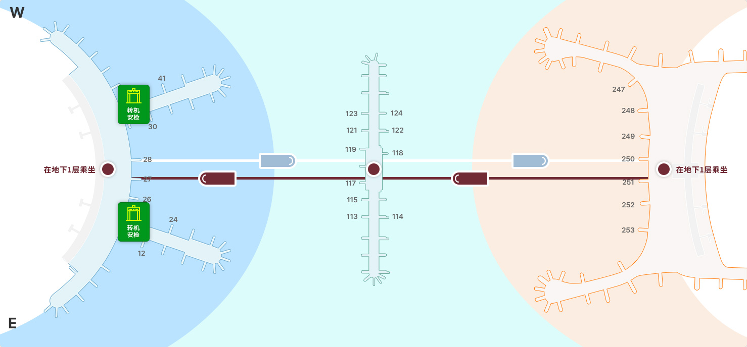 乘坐摆渡列车(B1)开往登机楼的摆渡列车