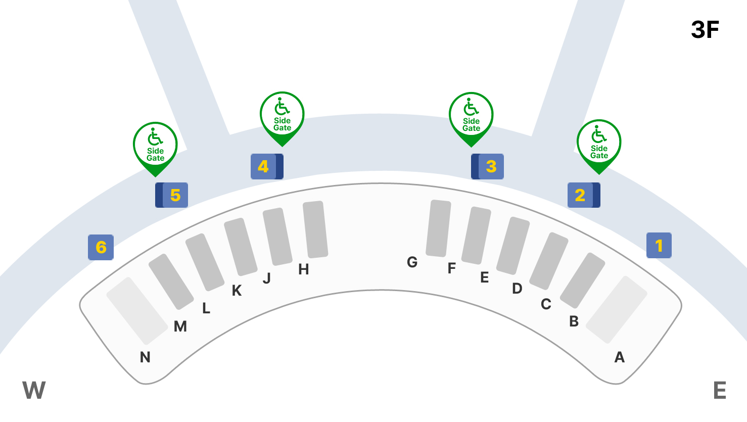 | Departure Hall | 6 (All) | 5 (Side Gate) | 4 (Side Gate) | 3 (Side Gate) | 2 (Side Gate) | 1 (All) |