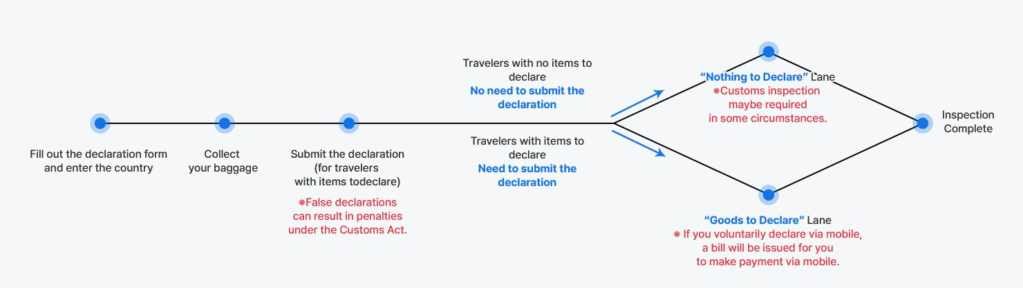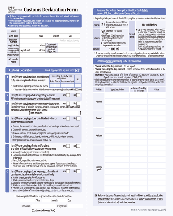 - Please note that if you falsely complete the customs declaration or fail to declare items and are caught in the duty-free lane, you may face penalties (confiscation of goods, fines, imprisonment) under the Customs Act.