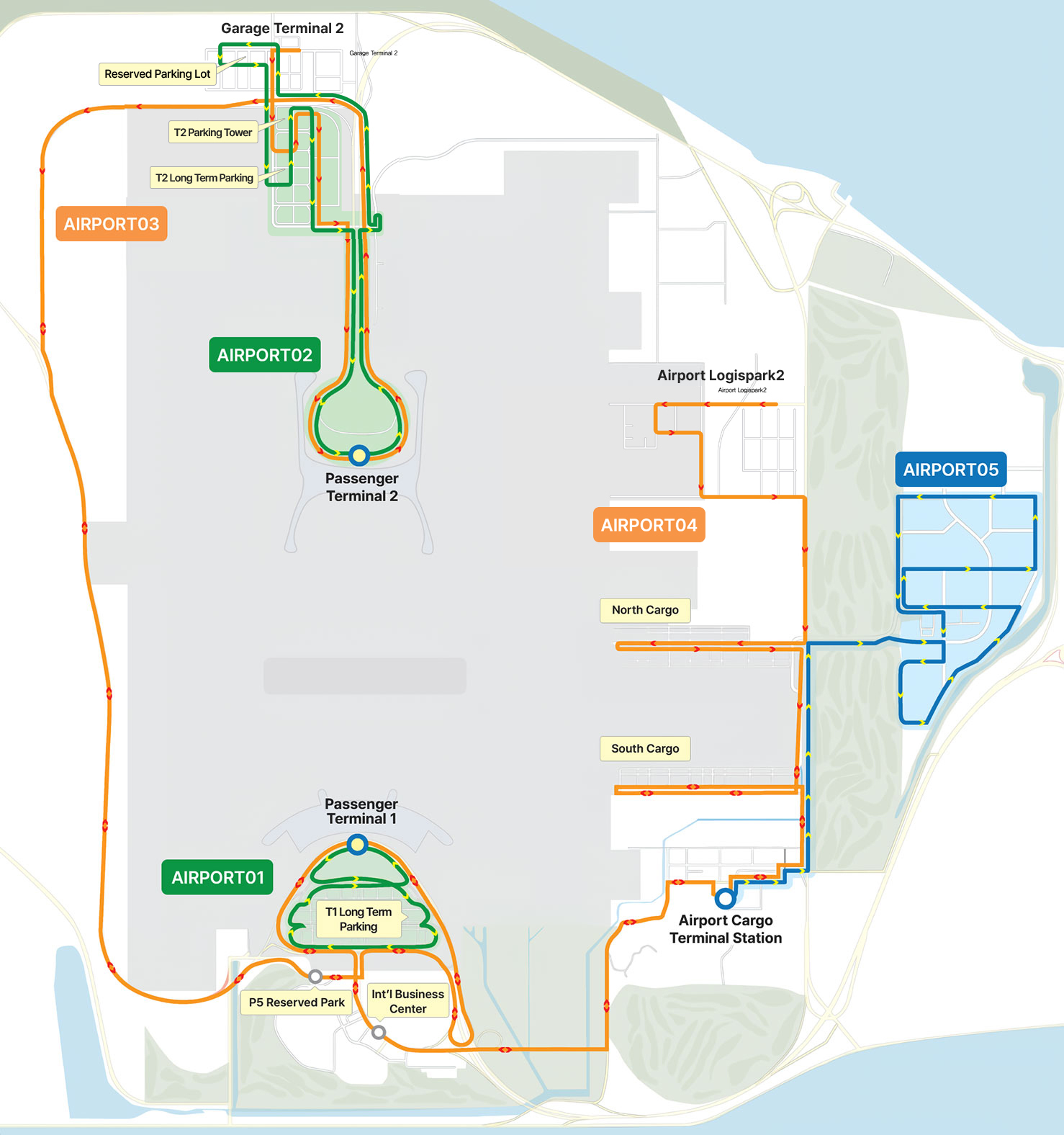 | AIRPORT 01 | Terminal 1 ↔ Terminal 1 Long-Term Parking Lot | 8–16 minutes | 04:30~24:00 | 16 minutes round trip |