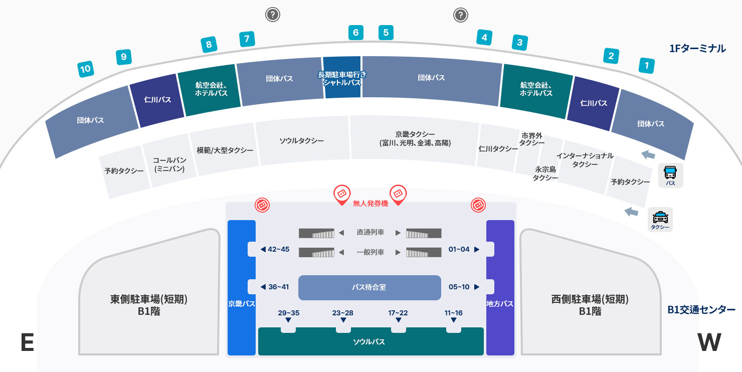 - 仁川空港から出発する公共交通機関のご予約の際は、航空機が到着して入国するまでの所要時間(1~2時間)を考慮してご予約ください。