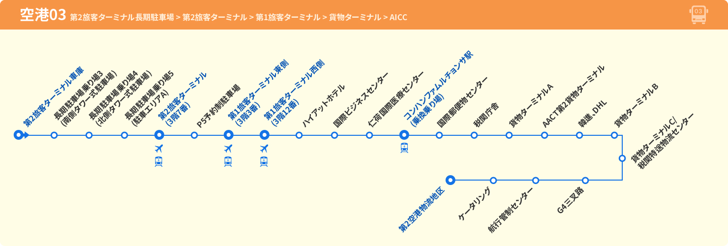 - 第1旅客ターミナル3階3番、12番ゲート前乗り場で乗車