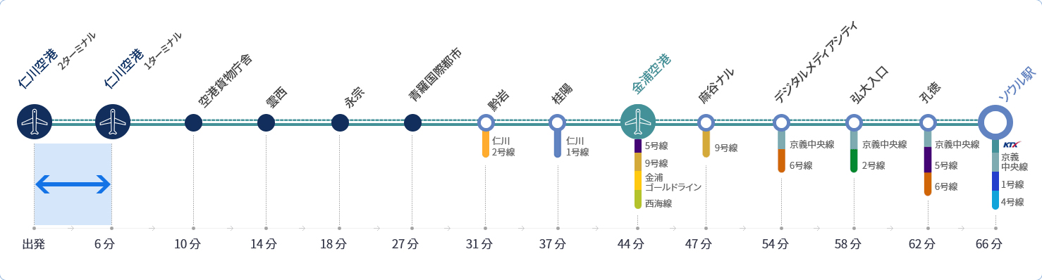 料金、時刻など、空港鉄道の利用に関する詳細は空港鉄道お問い合わせの電話番号(1599-7788)または空港鉄道ホームページをご参照ください。