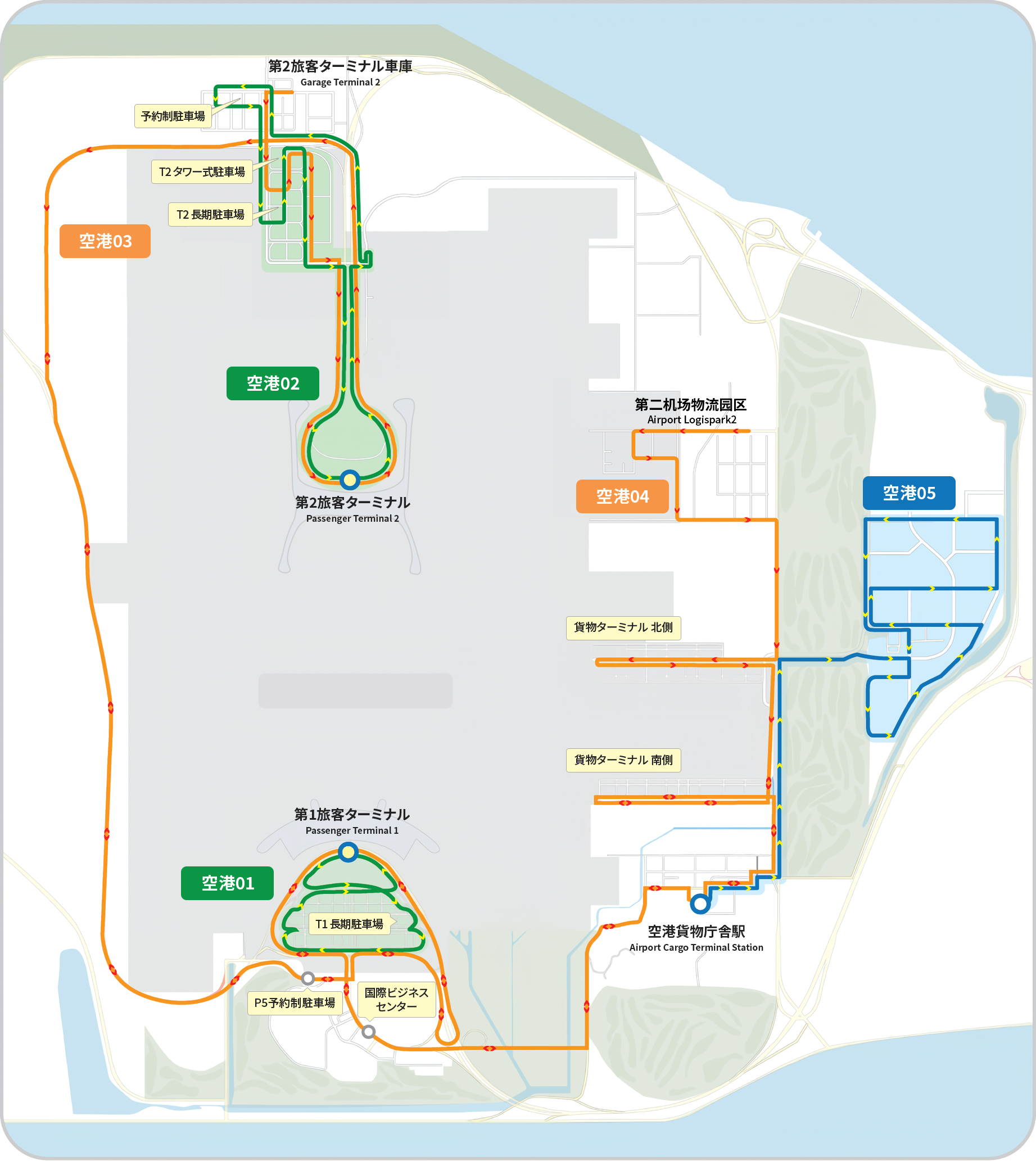 | 空港04 | AICC → 貨物ターミナル → 国際ビジネスセンター → 第1旅客ターミナル → P5予約制駐車場 → 第2旅客ターミナル | 5~20分 | 04:30~23:20 | 片道72分 |