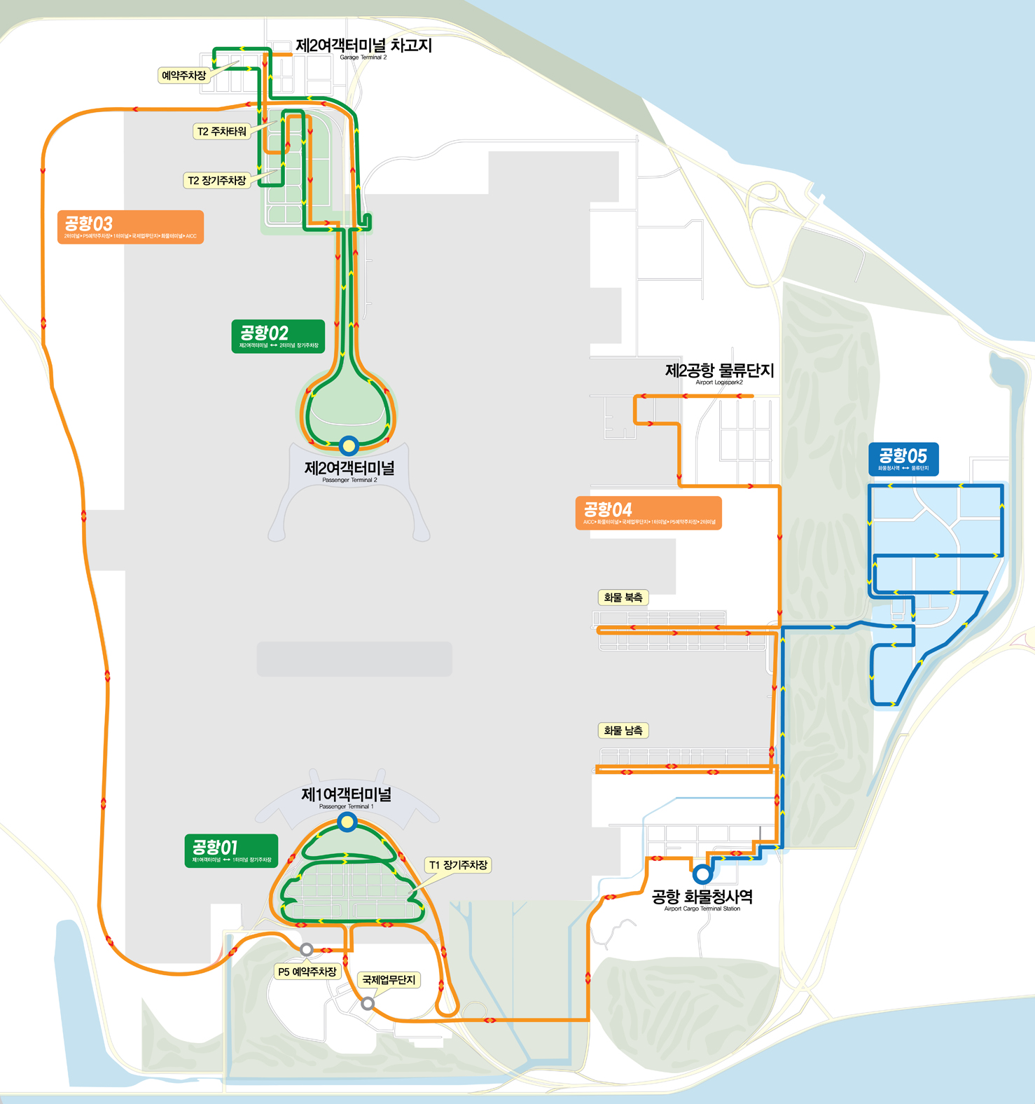 | 공항 04 | AICC → 화물터미널 → 국제업무단지 → 1터미널 → P5예약주차장 → 2터미널 | 5~20분 | 04:30~23:20 | 편도 72분 |
