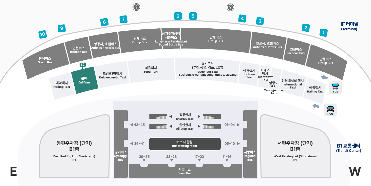 | 승차장 | 제1 여객터미널 1층 10C | 제2 여객터미널 1층 8D |