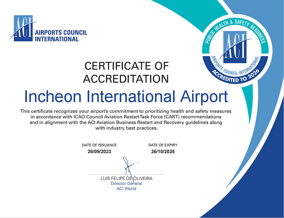 仁川机场于2020年在亚太地区最先获得了由ACI颁发的机场防疫认证(AHA),之后又连续3年获得了再认证,世界级防疫水平得到了认可。 随后,获得了新冠疫情以后新实施的公共卫生安全认证(Public Health & Safety Readiness Accreditation),同时机场应对突发防疫事宜的水平也获得了认可。