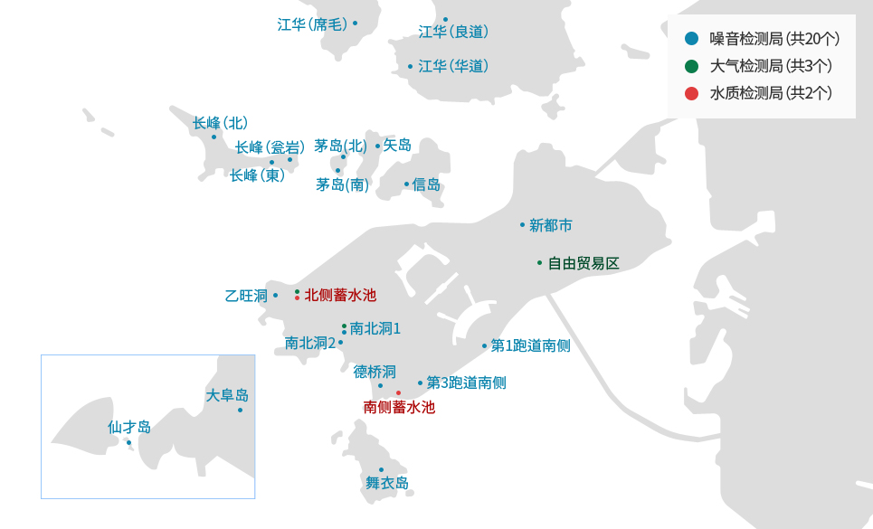 仁川国际机场于2000年10月建造完成环境监测设施并运营至今,该设施可24小时持续监测飞机噪音、大气质量等环境影响因素。同时根据周边环境的变化,不断进行增设及重新定位等,竭尽全力进行环境监测。