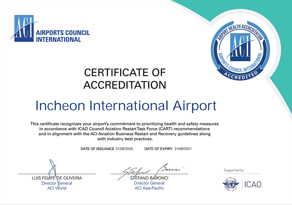 仁川国際空港は2020年、アジア太平洋地域の空港で初めてACIが実施する空港健康認定プログラム(AHA)を取得、その後3年連続して再認証を取得して、 世界レベルの防疫インフラを認められました。次いで、新型コロナウイルス感染症以降に新しく導入された公衆保健安全認証(Public Health & Safety Readiness Accreditation)を取得し、 空港の防疫措置に関する緊急対応レベルについても認められています。