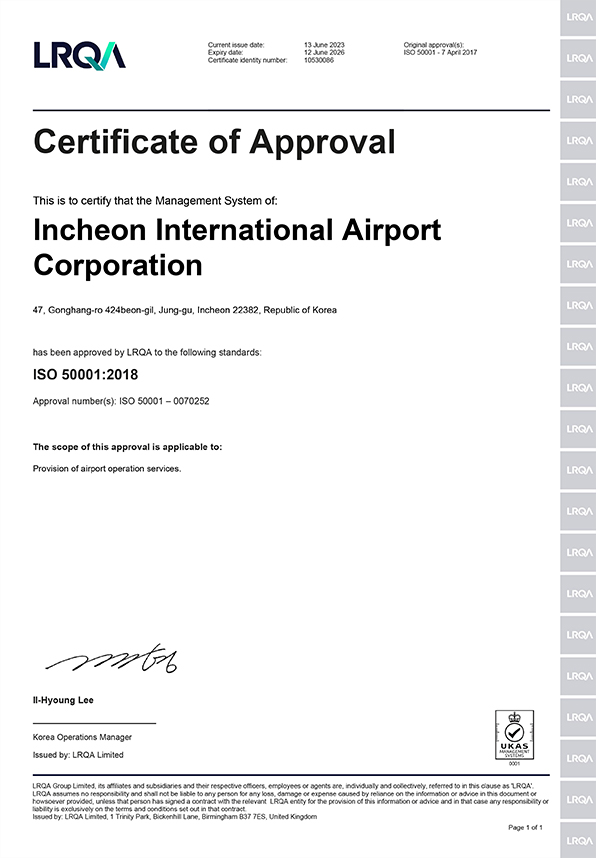 인천국제공항공사는 에너지 관리를 전사적 지속적으로 추진할 수 있는 에너지경영시스템을 구축하고 제3자에게 적합성을 평가받아 ISO 50001 인증을 유지하고 있습니다.